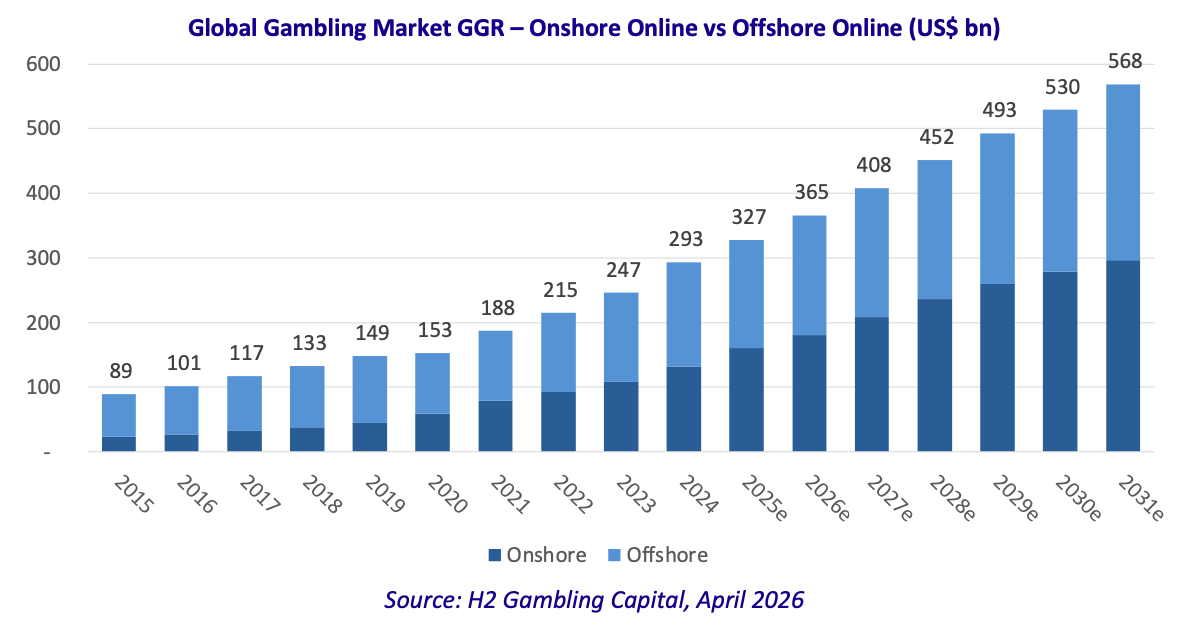 One of the more structurally significant trends captured in the updated H2 data is the shifting balance between onshore (regulated) and offshore (unregulated) online gambling. In 2015, the online market was overwhelmingly dominated by offshore operators, which accounted for approximately $65bn, or 73%, of global online GGR of $89bn. Onshore online — comprising markets where online gambling is formally licensed and regulated — represented just $24bn, or 27% of the online total.