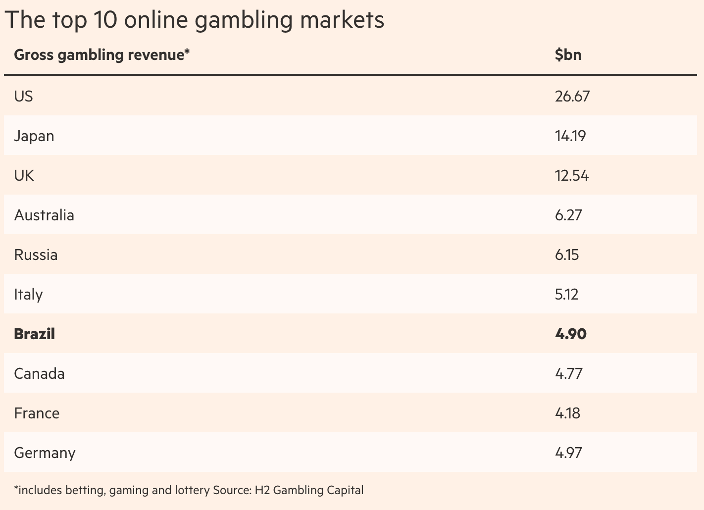 The Financial Times included H2's forecasts regarding the size of the Brazilian online gambling market in its recent piece on the market. The FT reports "Internet gambling has exploded in popularity in Brazil following the legalisation of fixed-odds sports betting in 2018, turning the football-mad nation of more than 200 million into the worlds seventh-largest market by revenue, according to data provider H2 Gambling Capital."