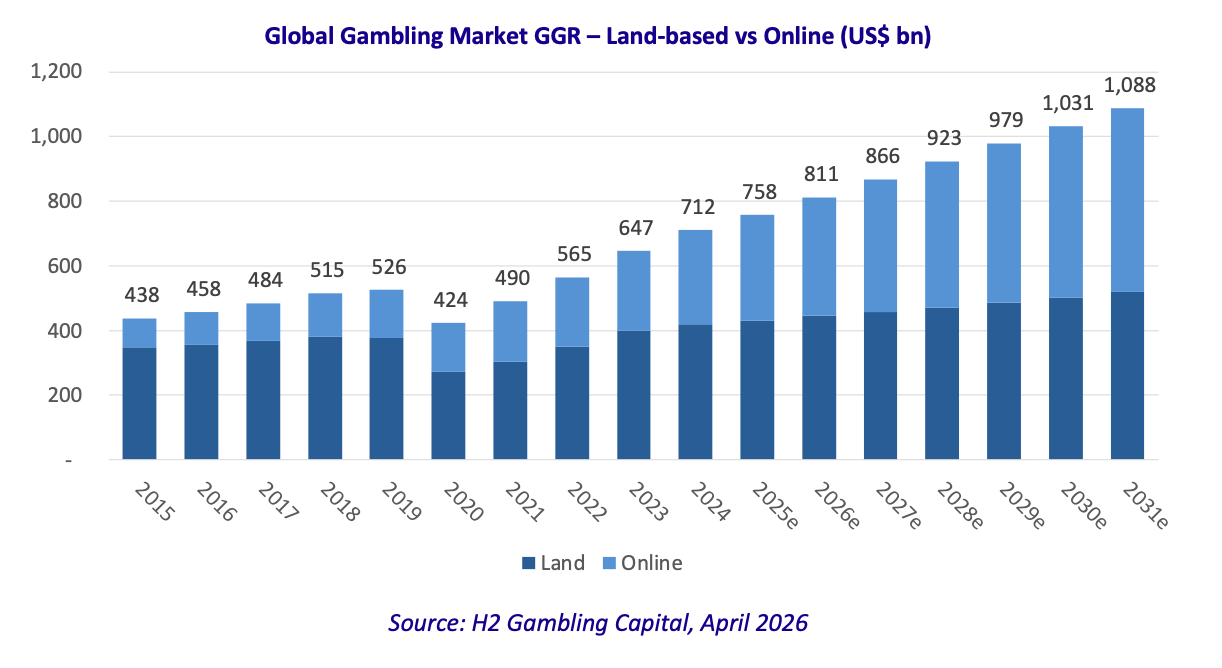 The most significant headline from this update is the confirmation that global gambling GGR will cross $1 trillion for the first time in 2030, with H2 now forecasting total global GGR of $1,031bn in that year, rising to $1,088bn in 2031. To put this in context, global GGR stood at $438bn in 2015, meaning the industry will have more than doubled in nominal terms over a 16-year period. By 2024 the market had already reached $712bn, reflecting the rapid post-Covid recovery and strong structural growth in online gambling.