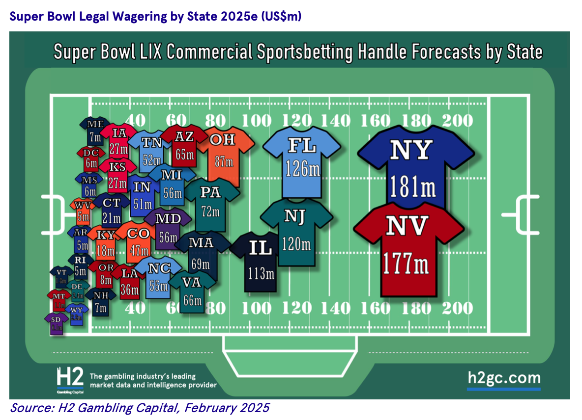 H2 estimates that $1.36bn was wagered through legal onshore sportsbooks for the 2024 Super Bowl, up from $1.10bn in the prior year. H2’s 2025 estimate suggests that the strong growth will continue, implying a 17% increase in Super Bowl wagers this year. This is predominantly driven by growth in existing states (i.e. states that were launched for Super Bowl 2024) – which account for c75% of the year-on-year growth, with new states accounting for c.$57m of handle...